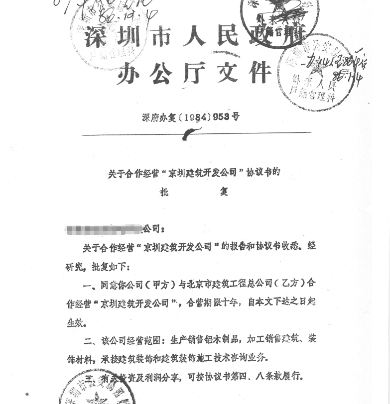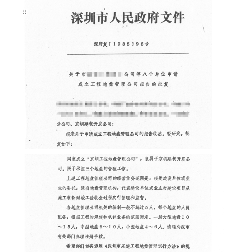 经过不懈努力,1985年5月,深圳市人民政府正式批准,京圳工程地盘管理公司成立,成为深圳市首批八家地盘管理公司之一。