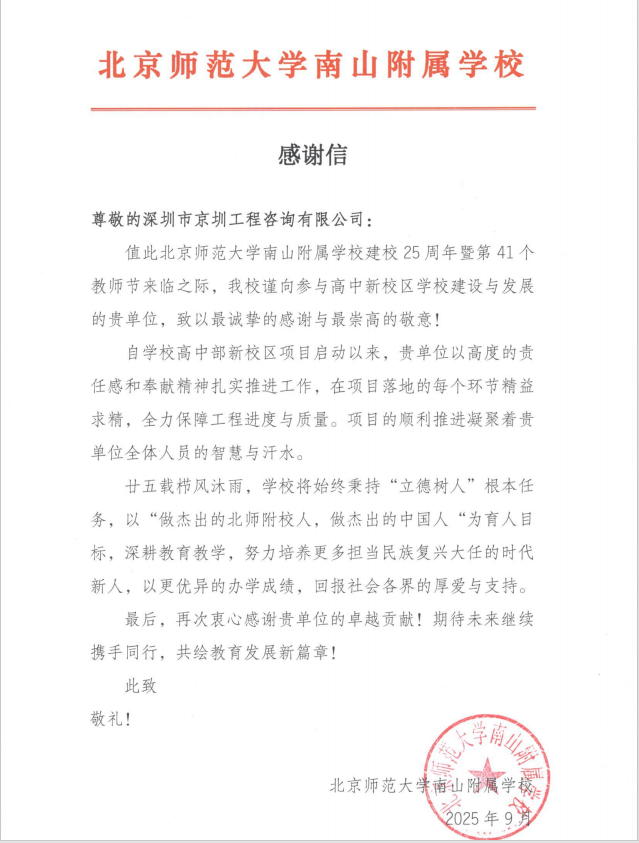 近日,北京师范大学南山附属学校发来感谢信和锦旗,对京圳公司以高度责任感和奉献精神扎实推进深圳市第三十高级中学项目监理工作,全力保障工程进度和质量,表示感谢。这不仅是对项目监理部突出表现的认可,更是对京圳公司国企担当的肯定。